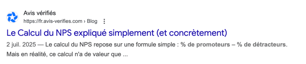 Le title est en bleu, la meta description en gris, sous le title. C’est grâce à ces deux éléments clés que l’internaute comprend en un coup d’œil si votre page mérite un clic…ou pas.
