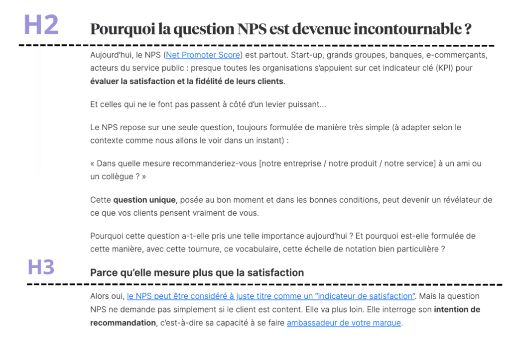 Nous l’avons dit : un bon contenu, c’est un contenu bien structuré. On utilise pour cela les balises H1, H2 et H3 pour hiérarchiser les idées, diviser l’article en parties, sous-parties, éventuellement sous-sous parties.