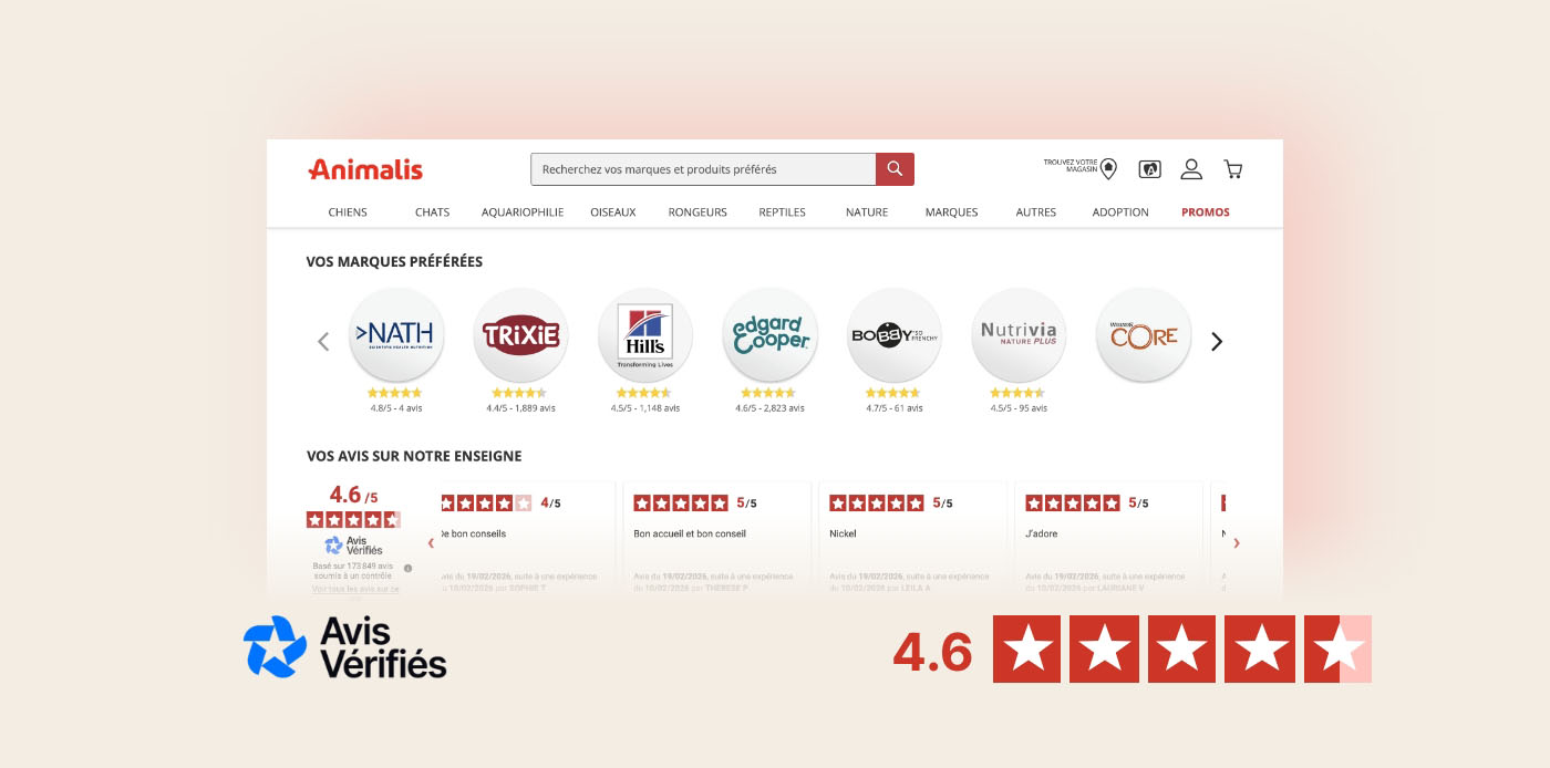 Depuis 2016, Animalis s’appuie sur la collecte d’avis avec Avis Vérifiés pour piloter les avis clients, gérer son e-réputation, valoriser ses établissements et disposer d’indicateurs fiables, notamment grâce au NPS. Cette démarche permet d’améliorer la visibilité des magasins, d’identifier les points forts et les axes d’amélioration, et de renforcer la transparence auprès des équipes comme des clients.